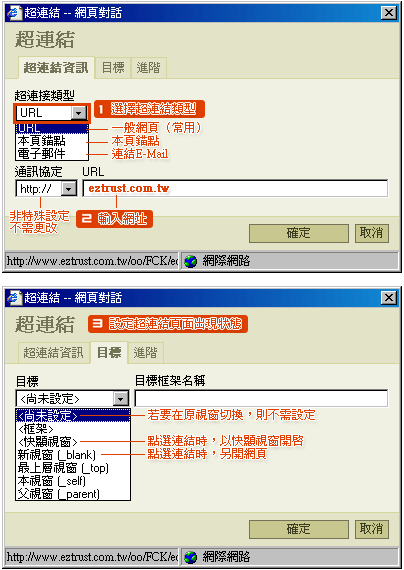 點選目標,下拉選擇新視窗(_blank),按確定完成。 |